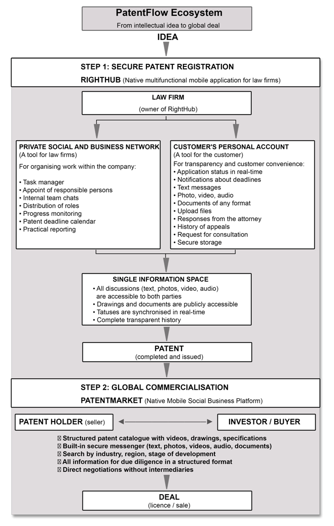 PatentFlow Ecosystem is the world's first native mobile ecosystem for Android and iOS, combining two key links in the chain of intellectual property creation and commercialisation: