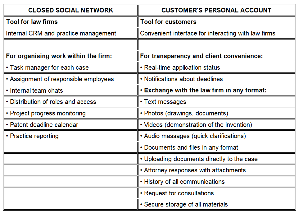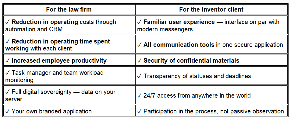 1. The lack of modern tools for secure communication with inventor clients. Correspondence in public messengers and sending documents by email create risks of confidential information leaks and loss of important materials.