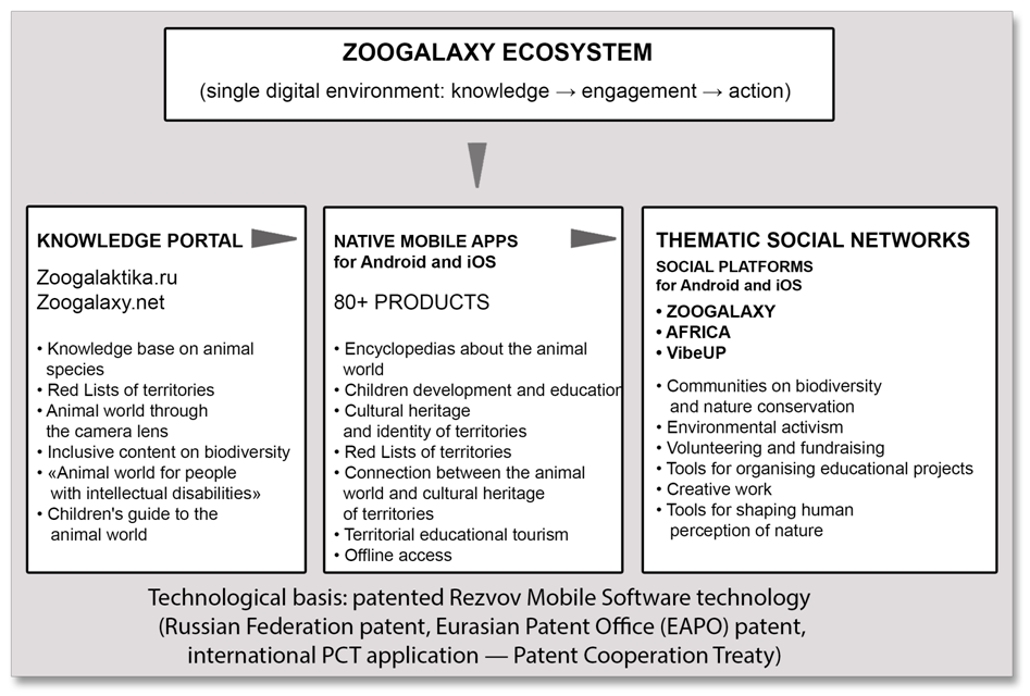 It was Rezvov Mobile Software's patented technology that became the foundation that allowed us to move from the idea of environmental education to its mass practical implementation in the form of the ZOOGALAXY ecosystem and related thematic mobile social networks.
